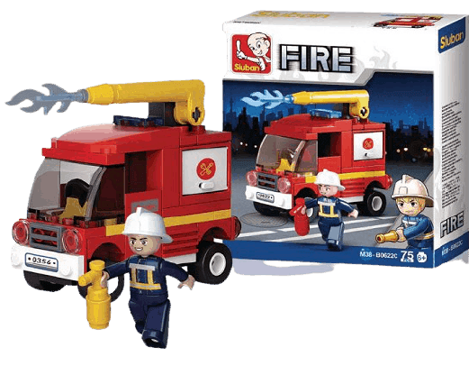 O jee er is brand! Wie komt er snel aan de brandweer en met deze kleine brandweer spuitauto van Sluban ben jij er als eerste